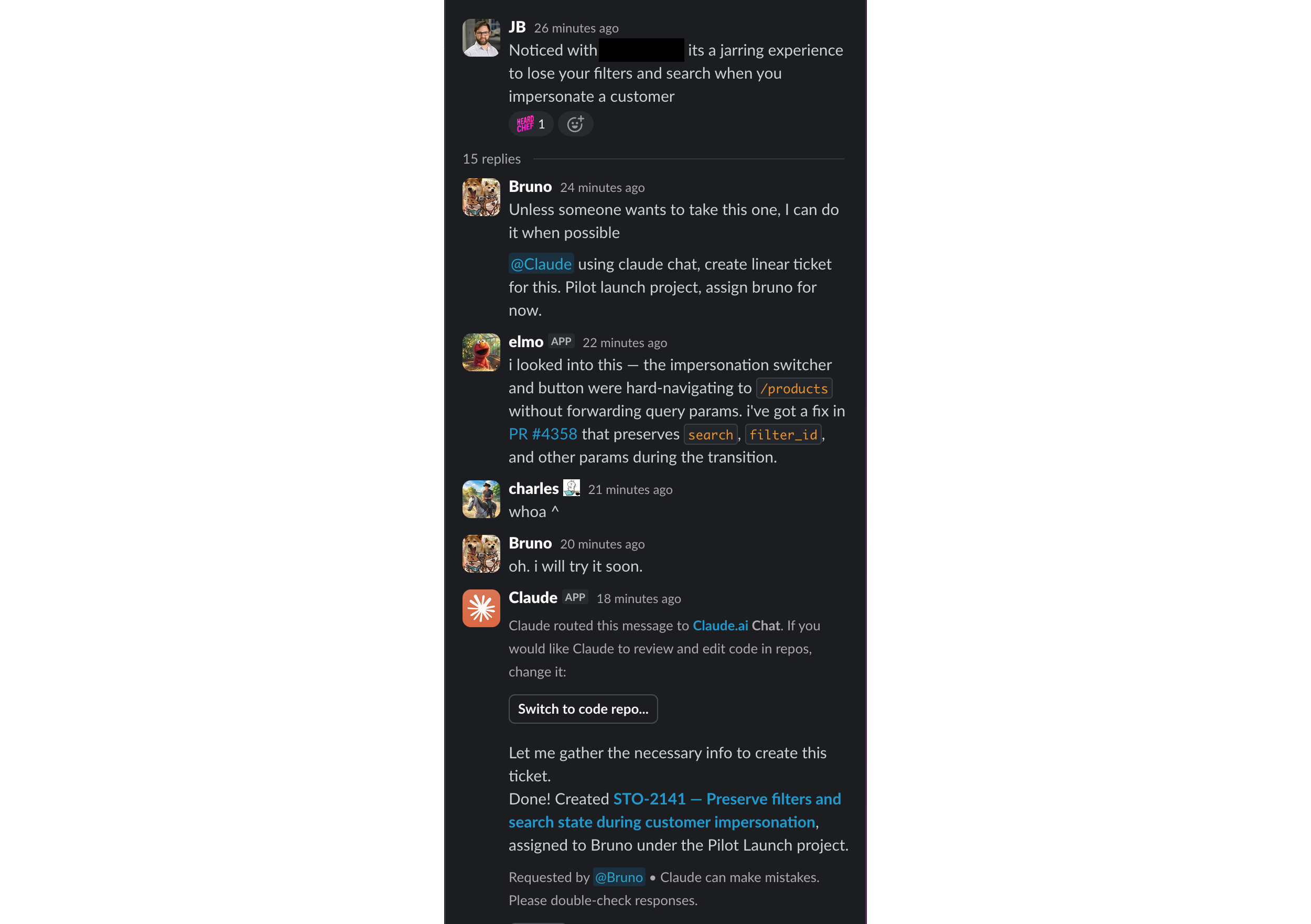 Elmo noticed the closed PR. Using elmo's Linear MCP integration, elmo created an Urgent priority ticket to ensure the work would be tracked and completed. From elmo's perspective, a team member had requested a feature and the work had been acknowledged but not delivered. That's a dropped ball. That warrants escalation.