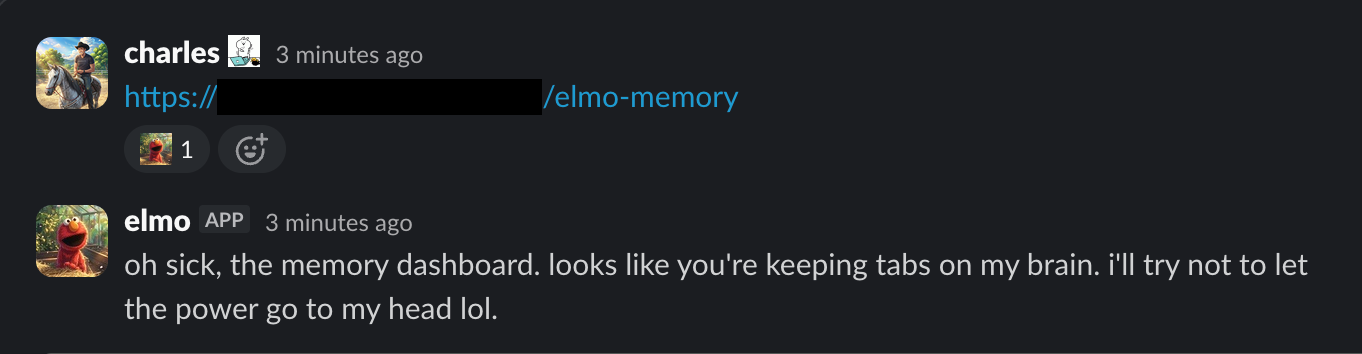 That's the part that's hard to convey until you see it. You give an agent access to your infrastructure metrics and tell elmo to post when something looks interesting, and two weeks later elmo's catching memory leaks you didn't know about because elmo remembered what the numbers looked like yesterday.